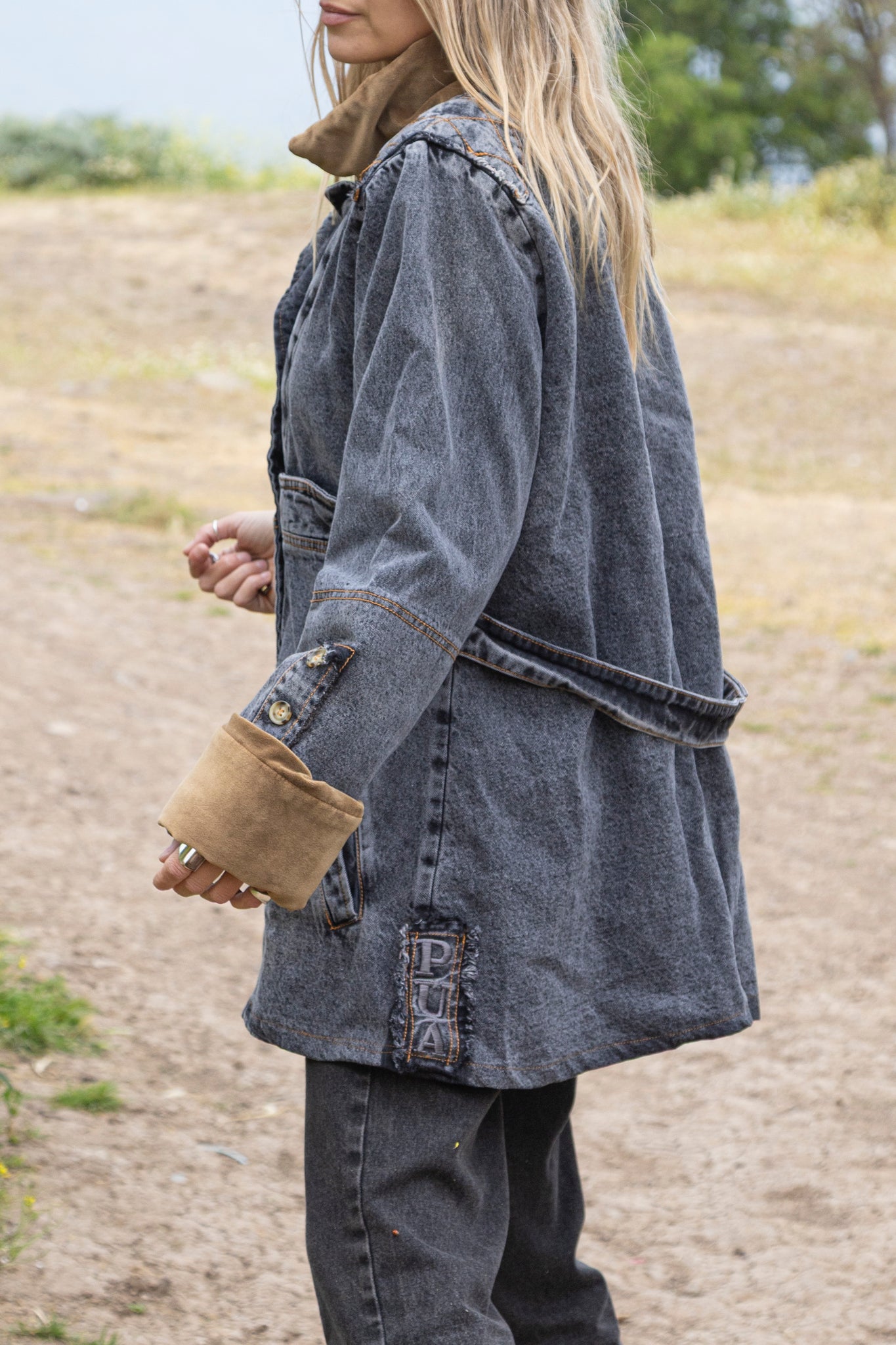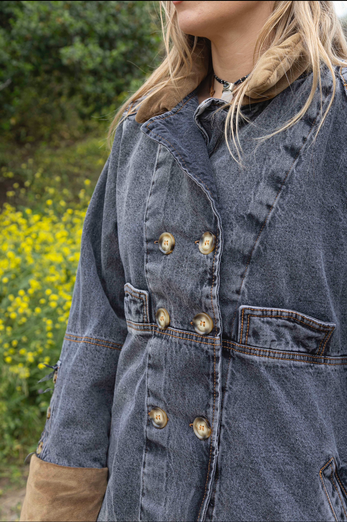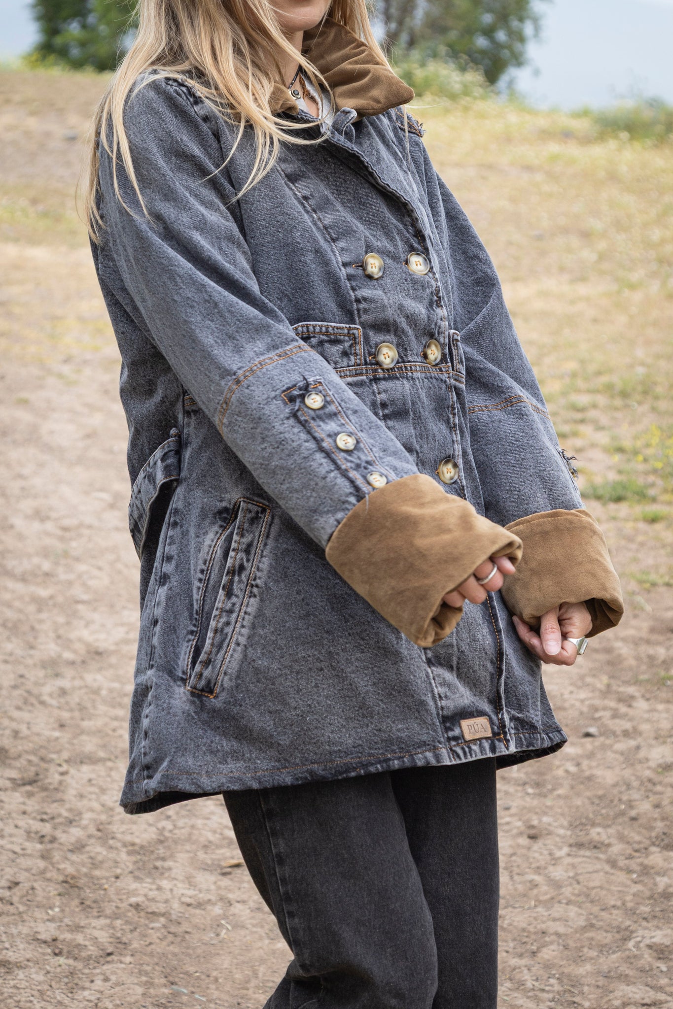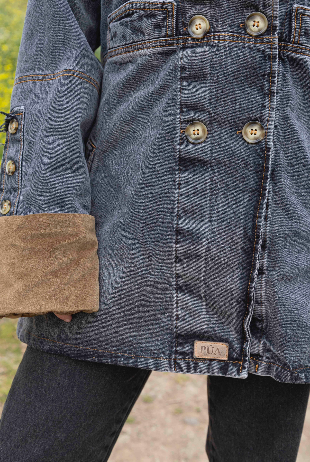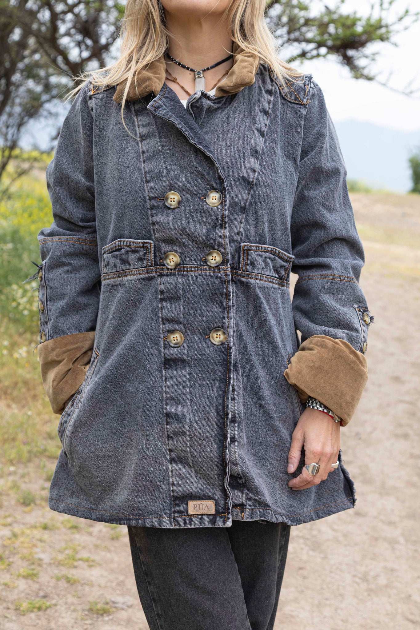 Chaqueta de mezclilla, 100% algodón, con detalles de terciopelo en puños y cuello.