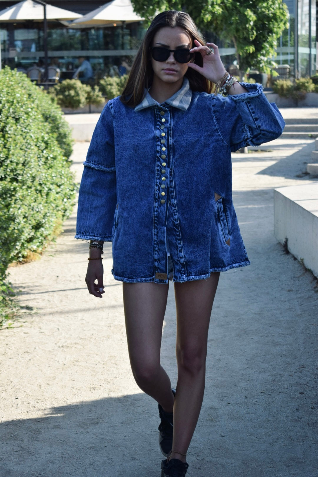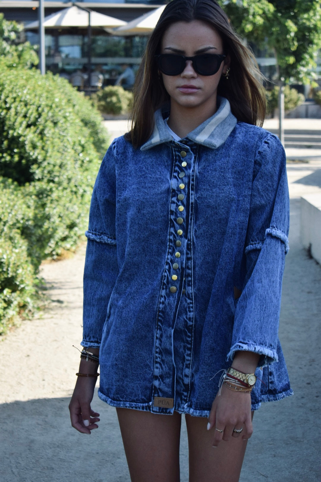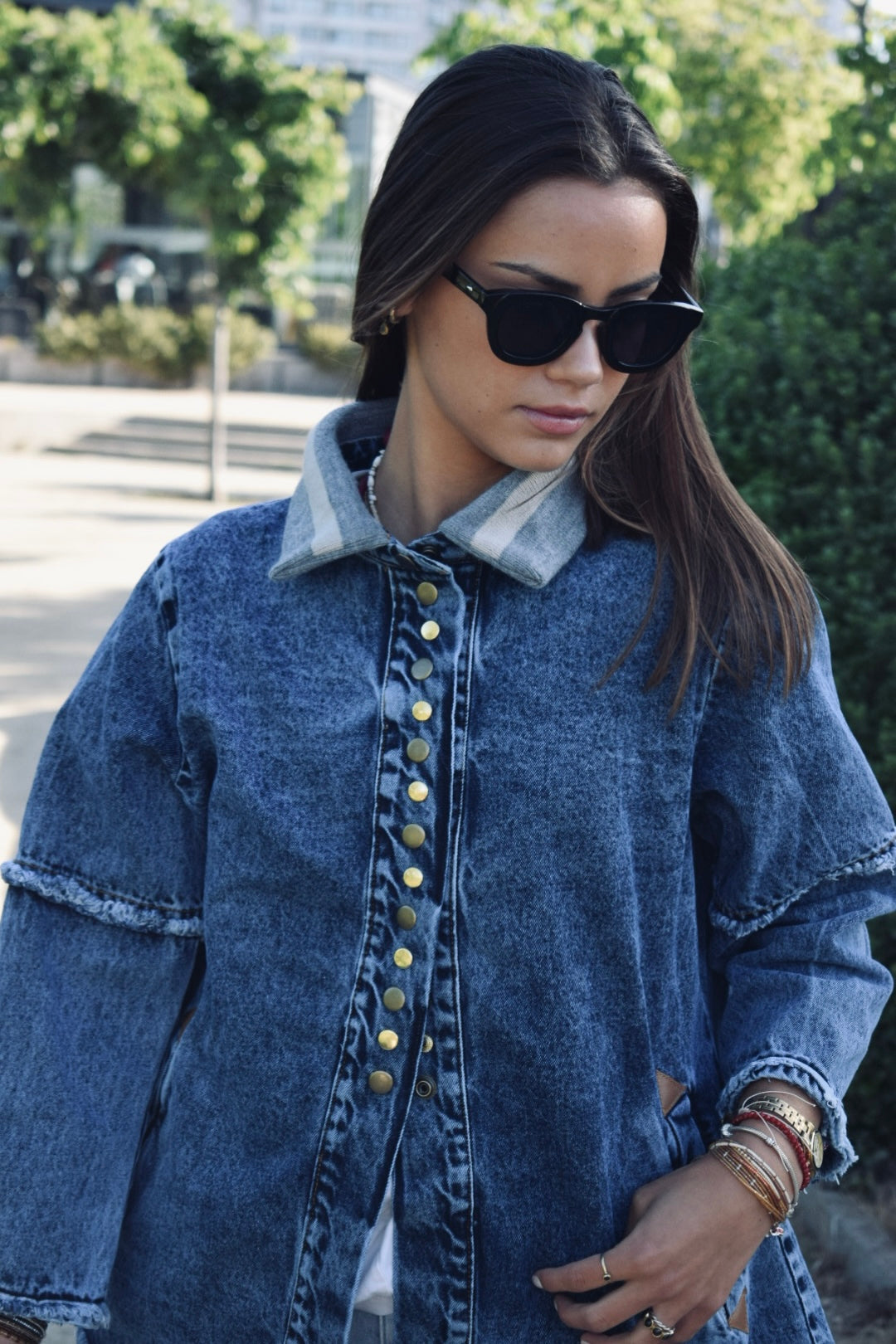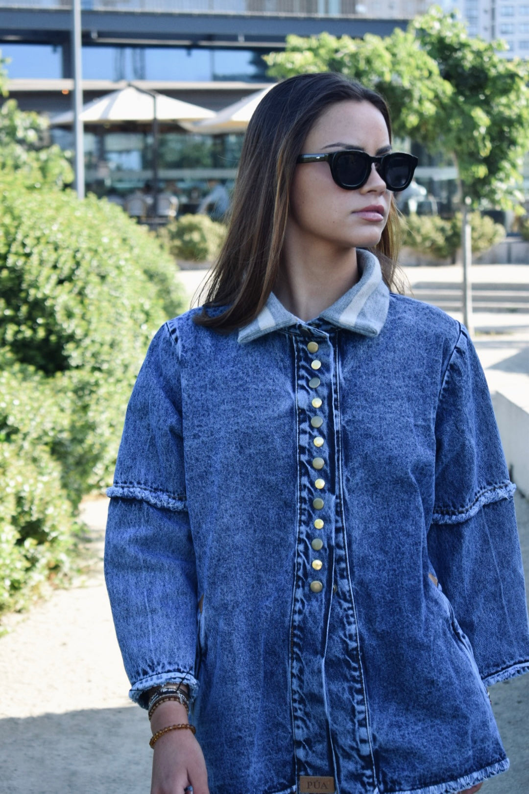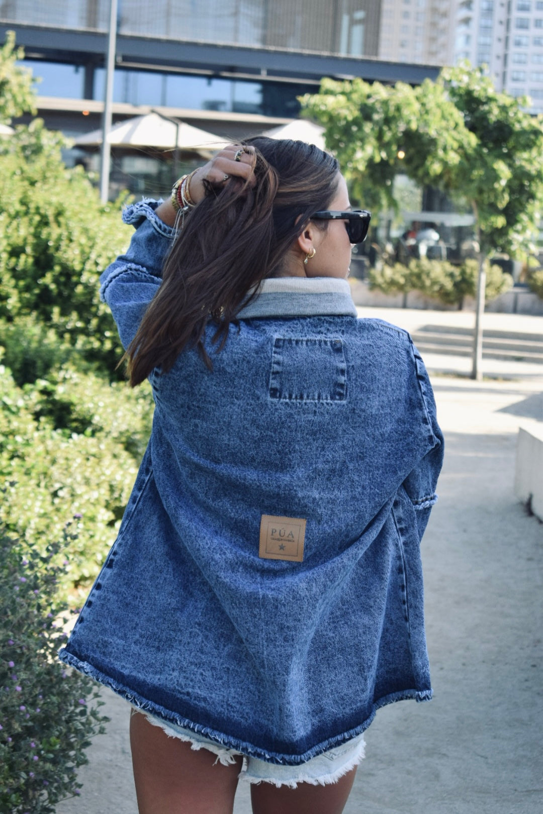 Chaqueta de mezclilla 100% algodón con efecto lavado y detalles en cuero.