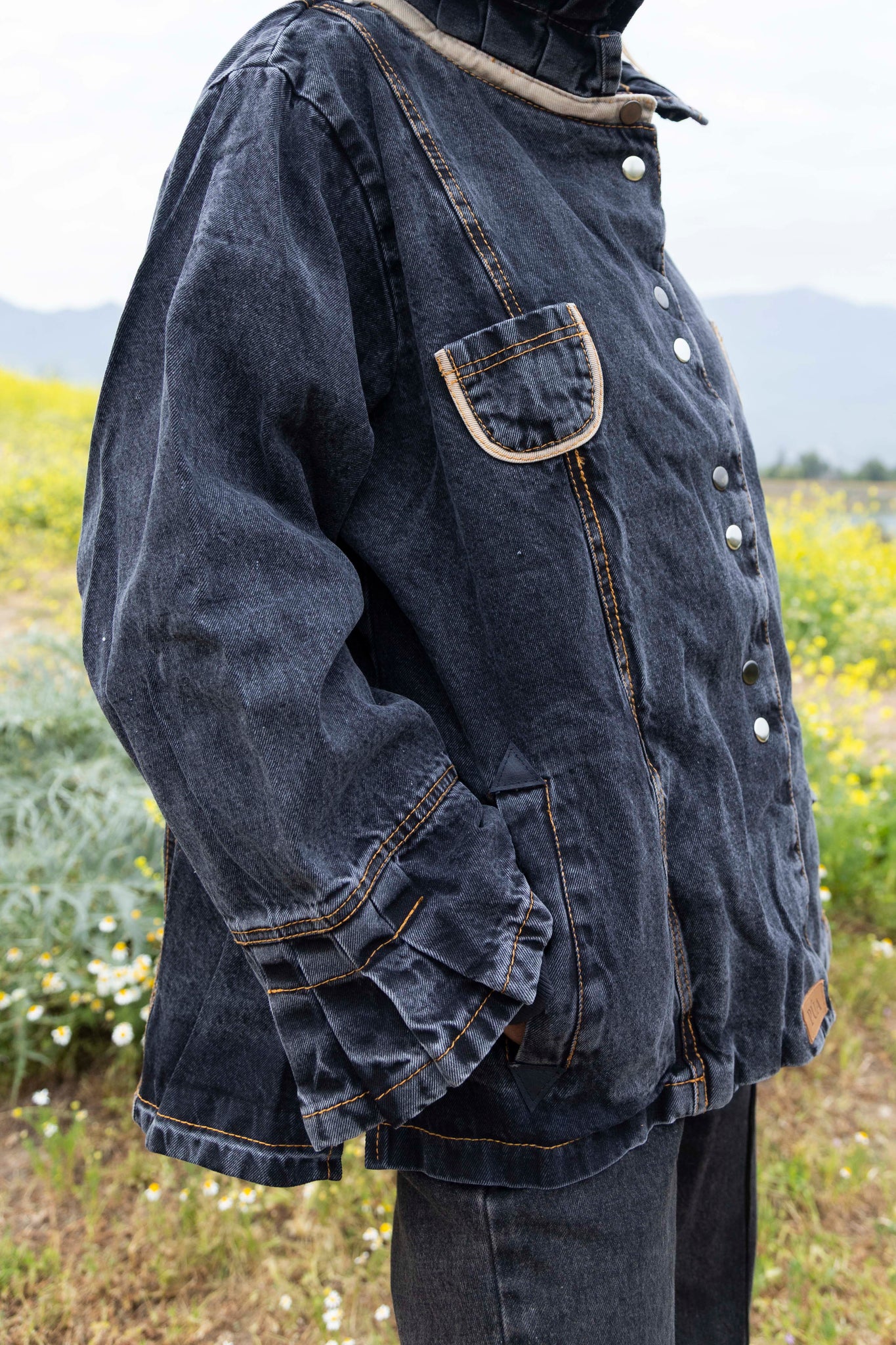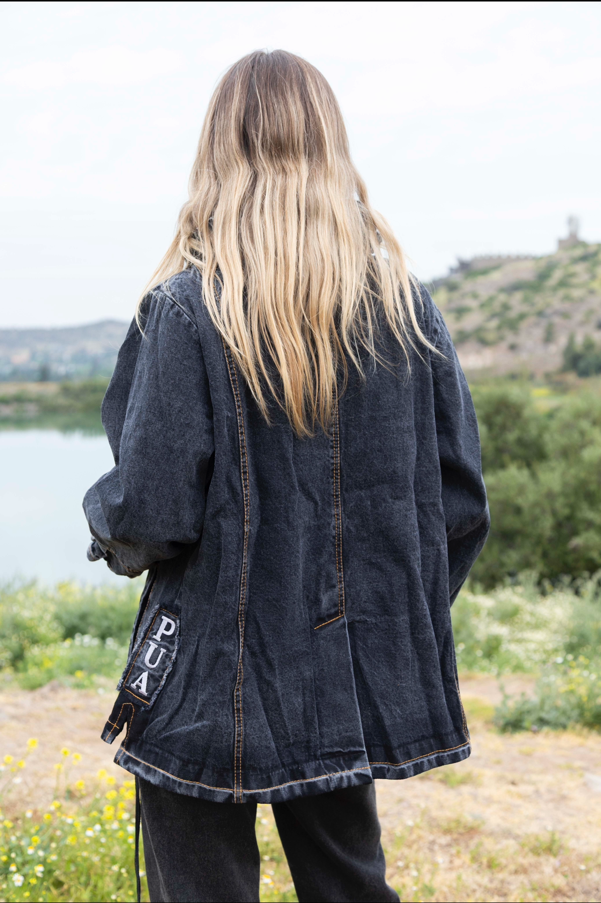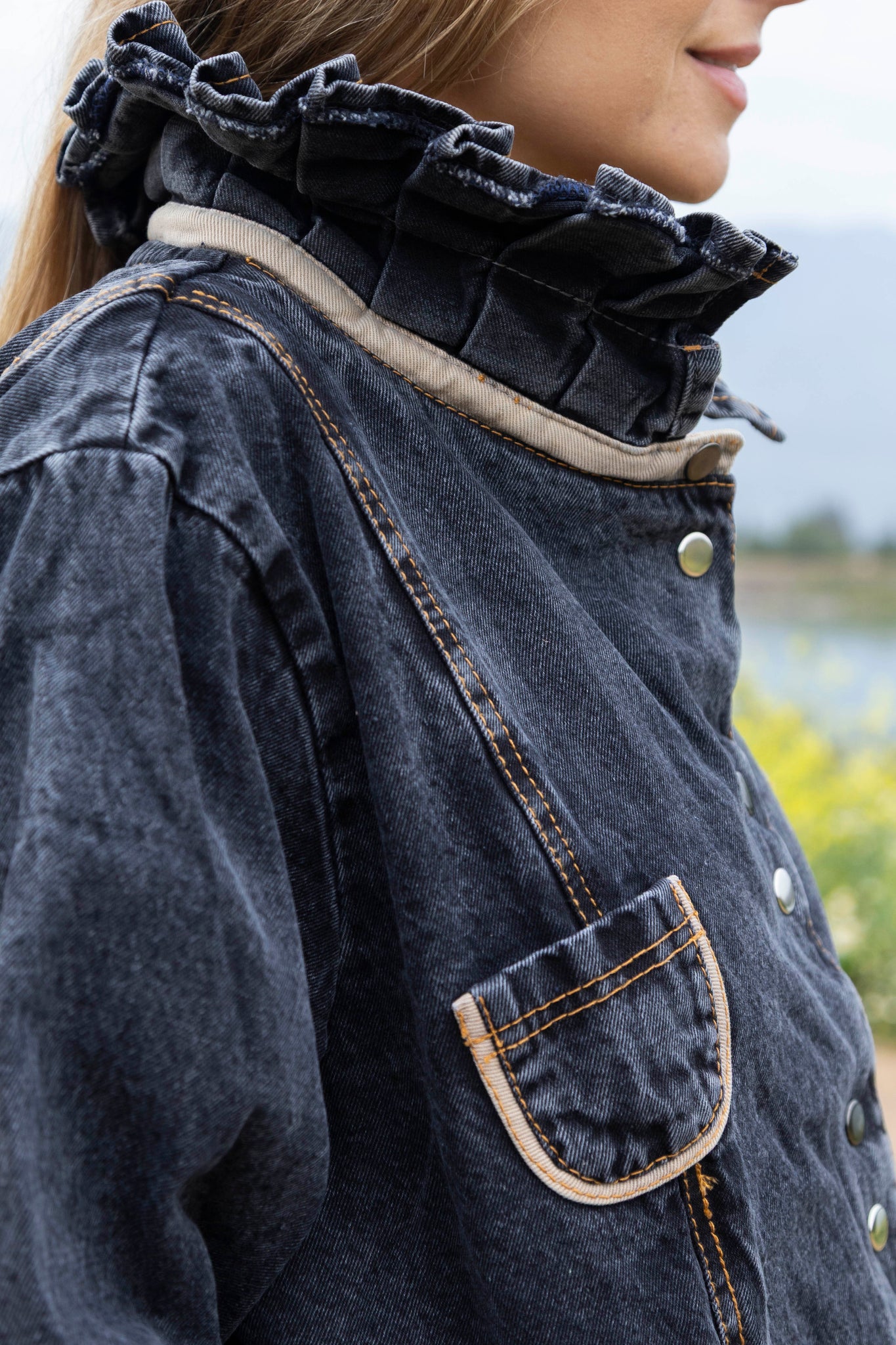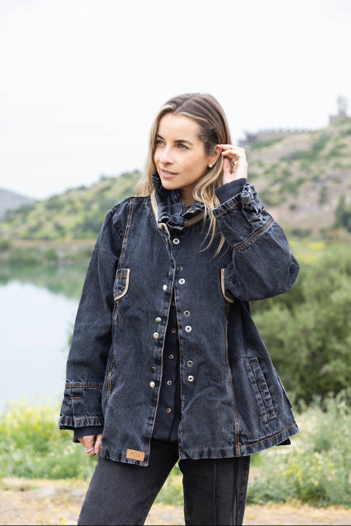 Chaqueta de mezclilla 100% algodón con efecto lavado y detalles en cuero.