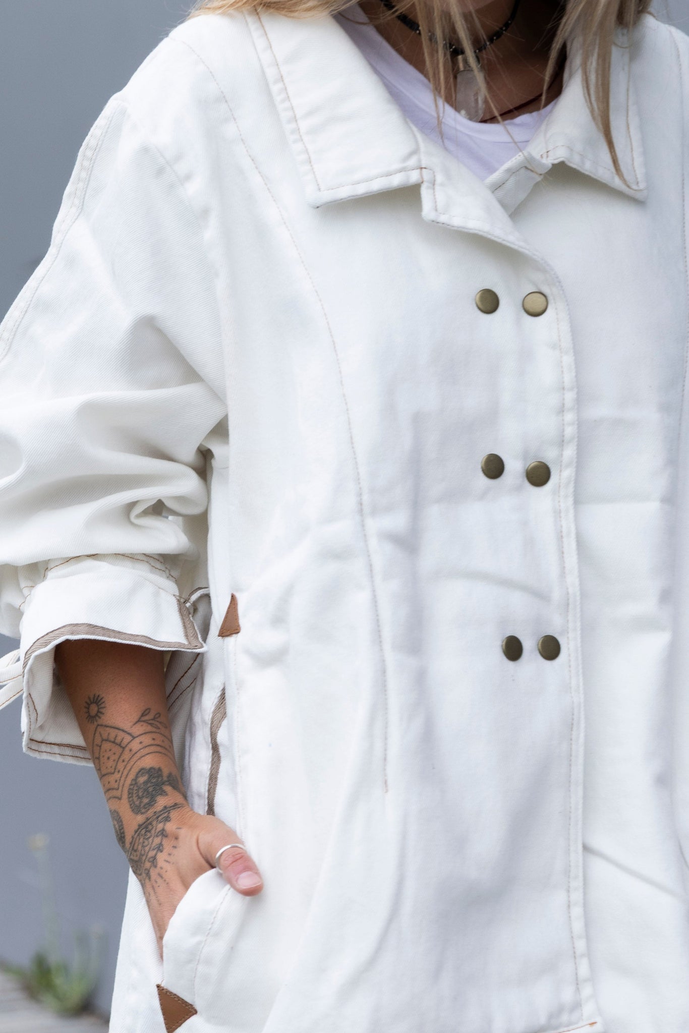 Chaqueta de mezclilla 100% algodón con efecto lavado y detalles en cuero.