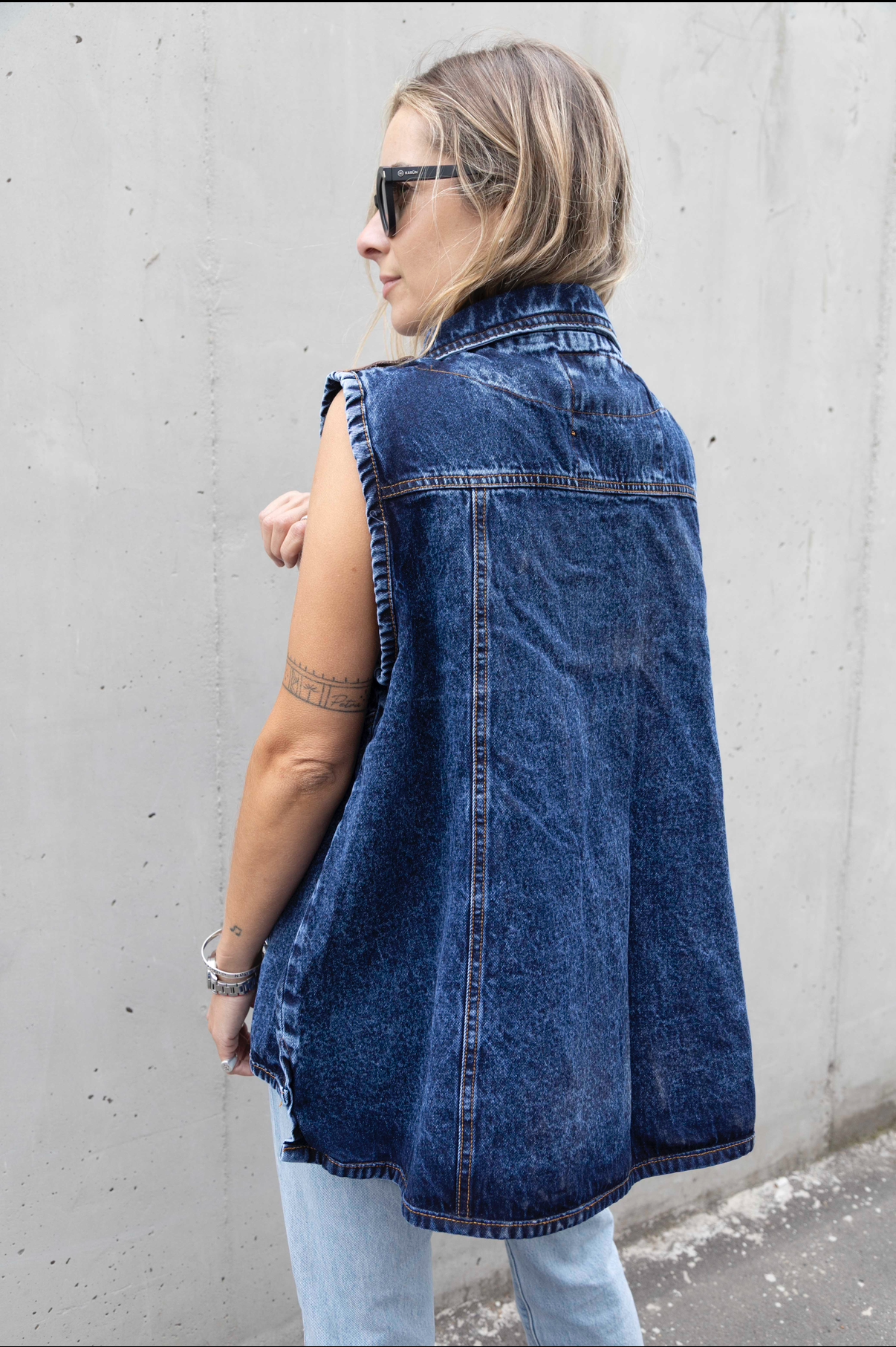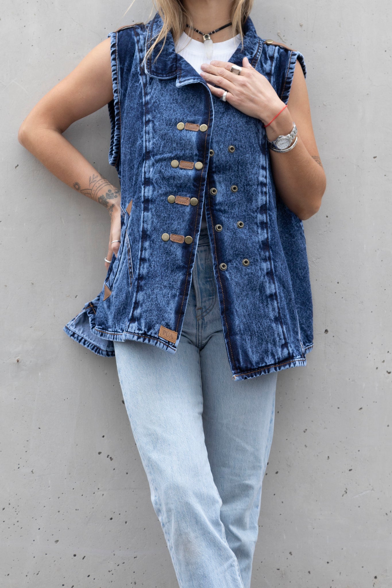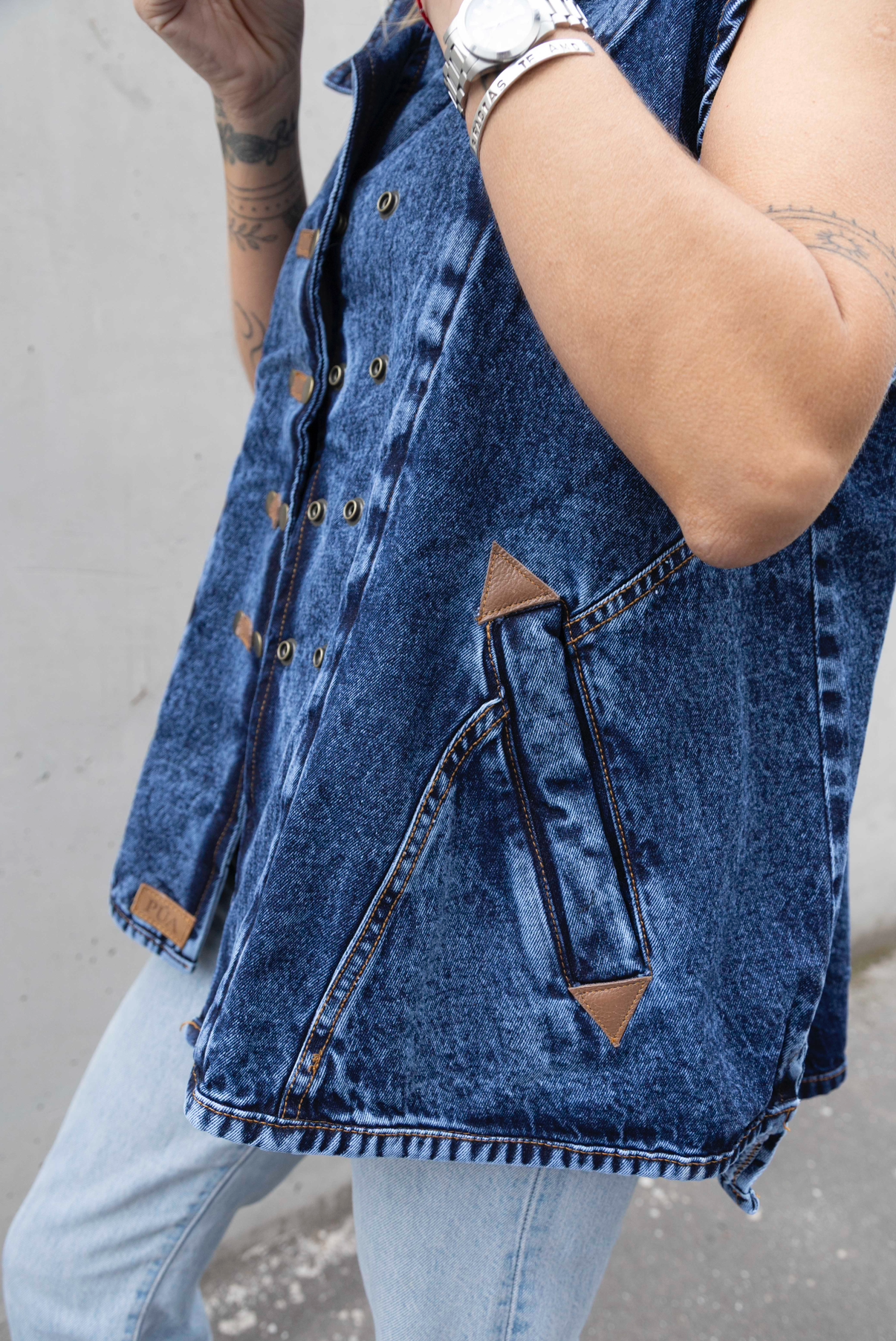 Una chaqueta sin mangas es siempre una buena opción para días de calor y nuestra Aydin es ideal para un look casual y con carácter. Corte asimétrico y bolsillos laterales que mantienen la silueta limpia y funcional. Broches metálicos con detalles en cuero que contrastan con la prenda.