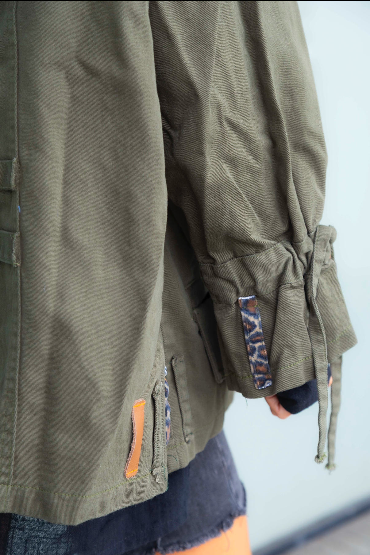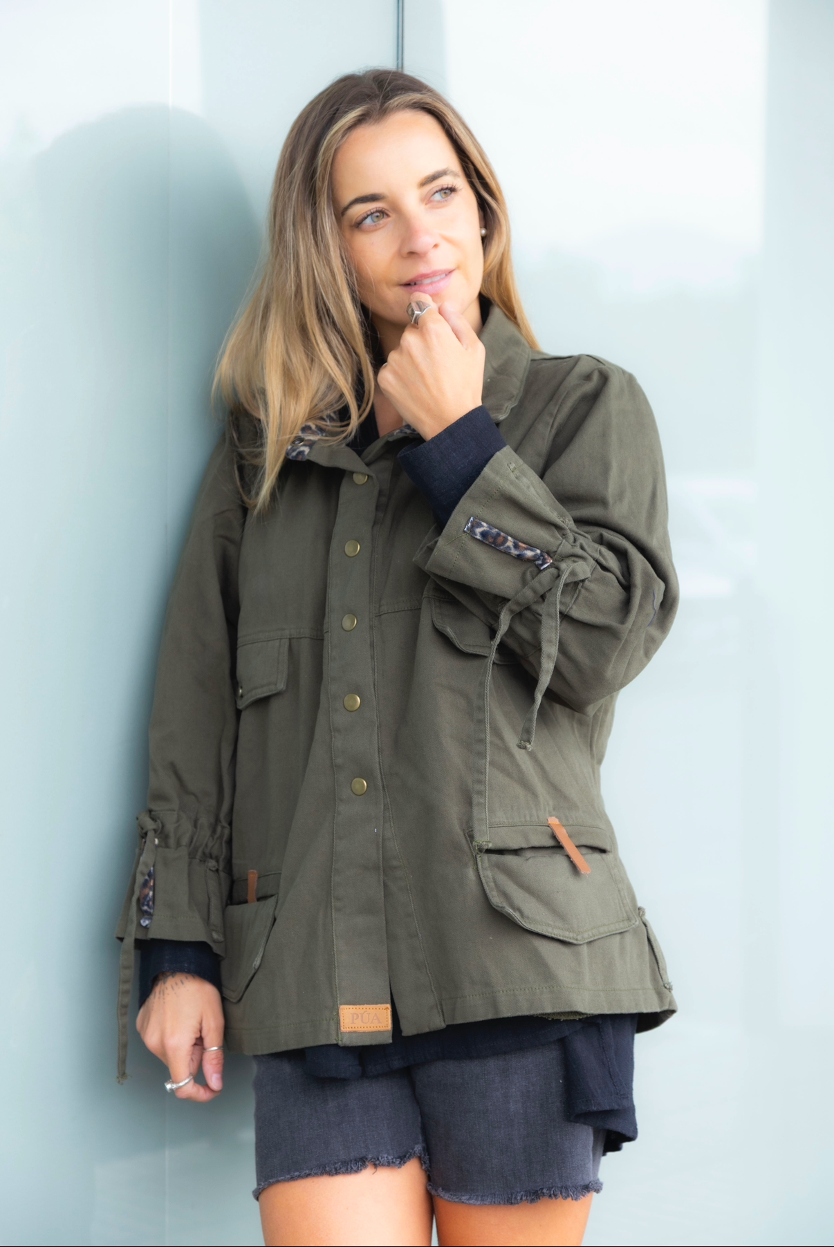 La Gyresun es una chaqueta moderna tipo safari con mangas ajustables, cierre frontal y combinación de diferentes telas en detalles como presillas y pie de cuello. Sin duda un must de esta temporada!