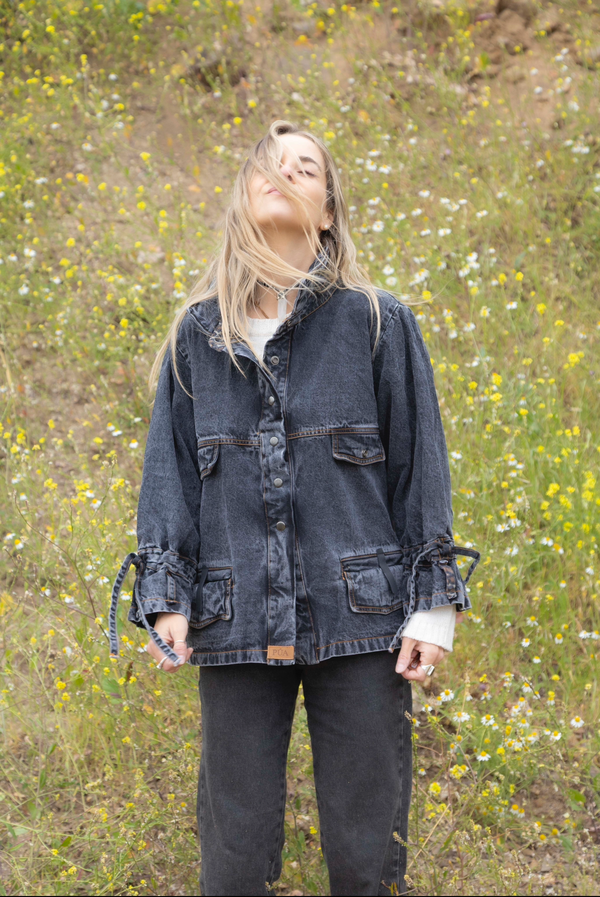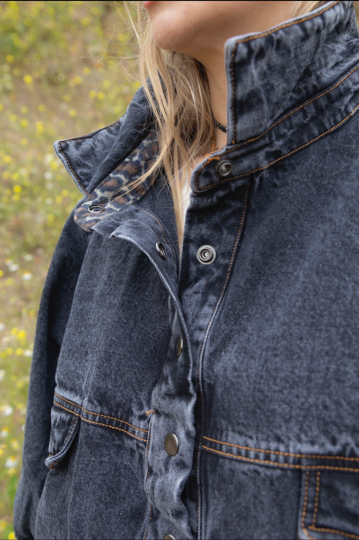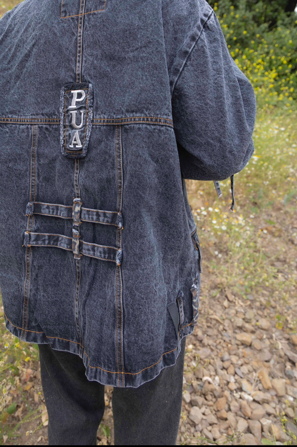 Chaqueta de mezclilla 100% algodón con efecto lavado y detalles en cuero.
