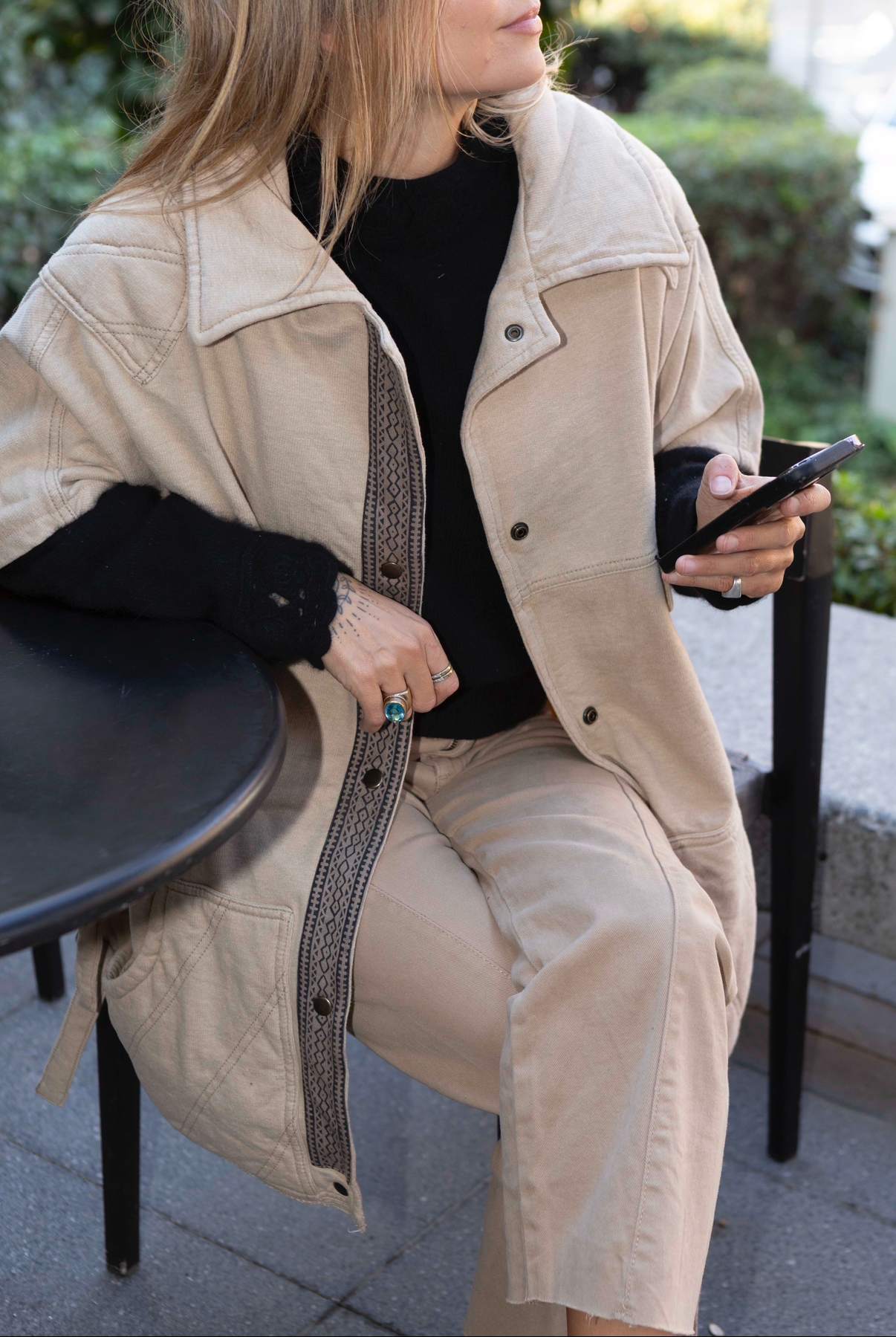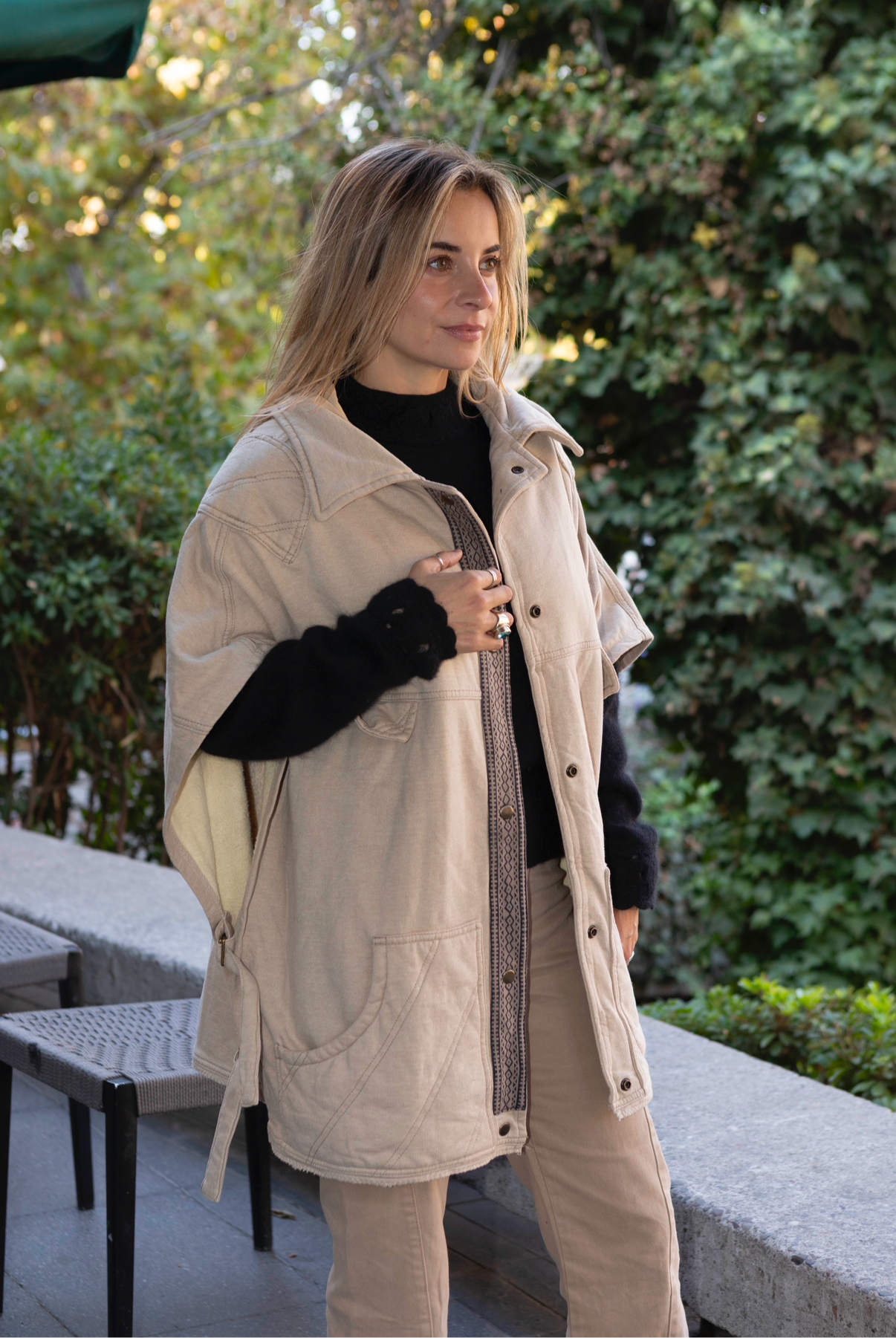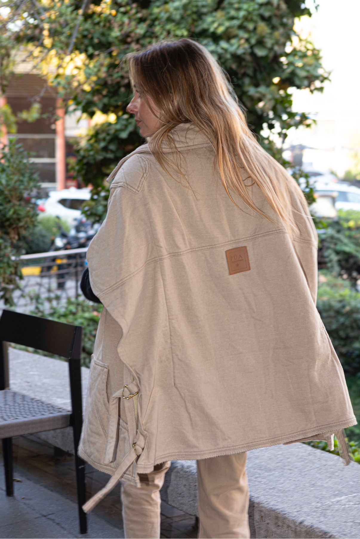 ¡Una bomba la capa Poros! En este tono neutro pero con detalles que la elevan completamente. Calce holgado y bolsillos amplios