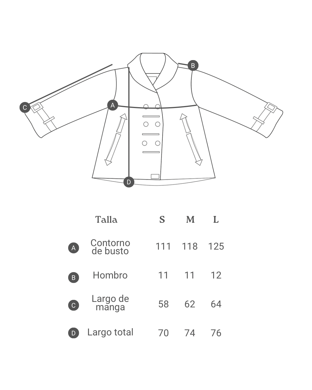 *Considerar que todos nuestros abrigos y chaquetas son hechos a mano, por lo que podrían tener pequeñas variaciones en detalles. Por ejemplo, cambio en la tonalidad de los cueros, telas o aplicaciones